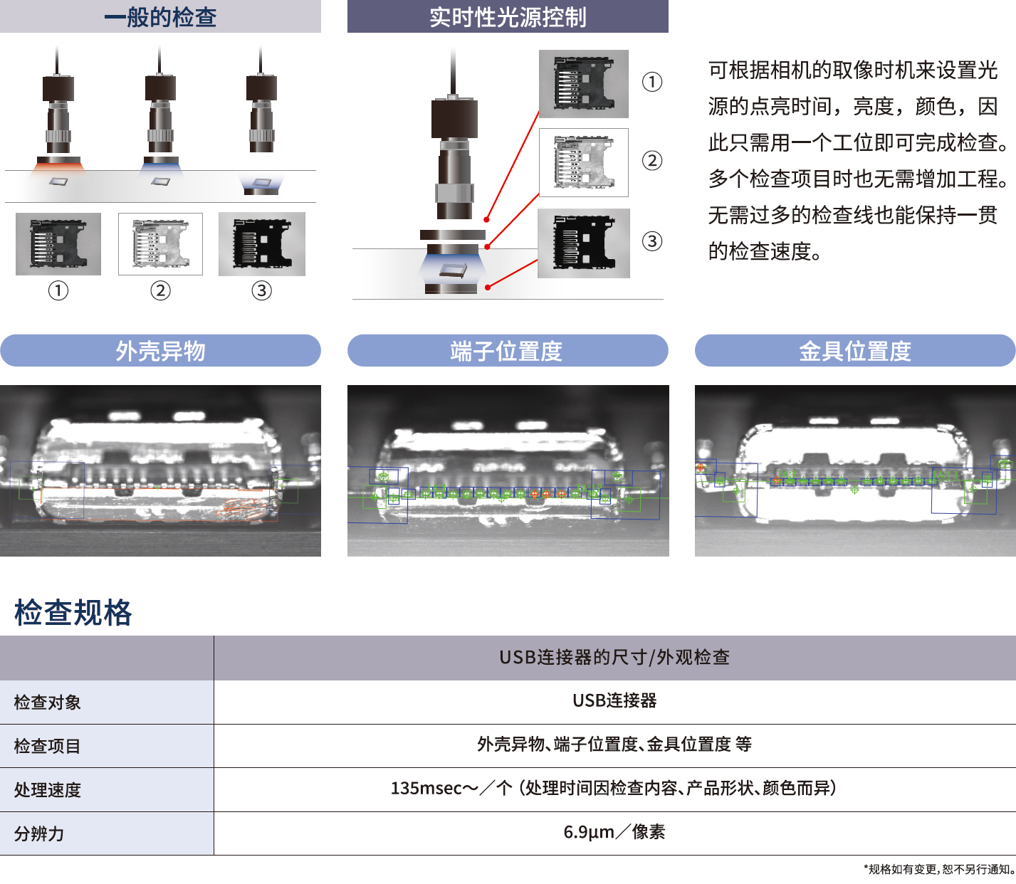 USBコネクタのサイズ/外観検査は1ステーションで複雑な検査を?qū)g現(xiàn)!USBコネクタの點検。ハウジング異物、端子位置度、金具位置度を點検する。チェック項目に応じて適切な光源を切り替え、最適な畫像でチェックします。