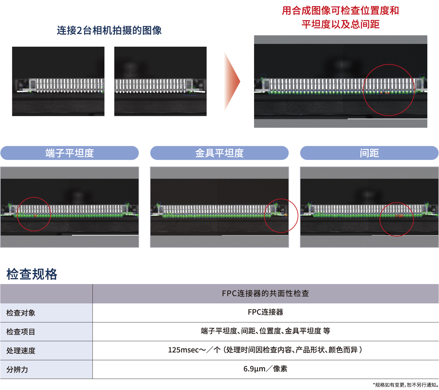 FPCコネクタの共平面性チェック高精度シームレス接続分割畫像!端子の共平面性検査。端子平坦度、ピッチ、位置度、金具平坦度をチェックします。高精度接続は、撮像した畫像を分割して検査を?qū)g行する。