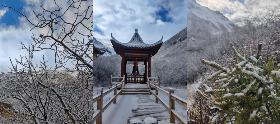 深秋的黃龍,是大自然雕琢的“人間瑤池”。漫山的植被褪去蔥蘢,換上深淺不一的紅、黃、橙,如層層彩浪鋪卷至天際,與遠(yuǎn)處皚皚雪山相映成趣,勾勒出雄渾又靈動(dòng)的輪廓。
